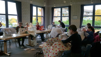 65 Decken liegen da auf dem langen Tisch – und mittlerweile (eine Woche später) sind noch mehr als weitere 20 Decken fertig. So viele Mit-Näherinnen haben von sich aus gesagt: den Rest nehmen wir nach Hause und machen dort fertig.